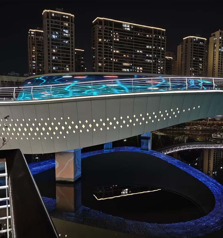 创新的LED网格屏,高透明度超轻重量,快速安装和维护等优势,16位高灰度,防水等级IP67. 适用于长期户外建筑外立面和动态照明工程,可任意拼接成(圆形.三角形.拱形)等不规则屏幕。